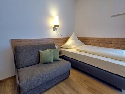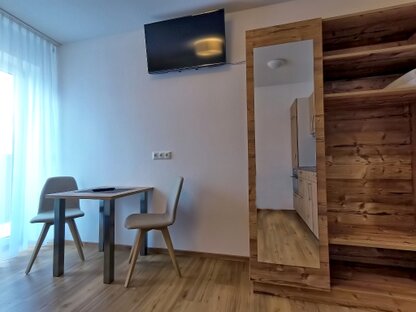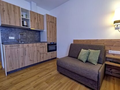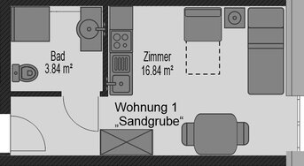 Die Ferienwohnung mit 20 qm Grundfläche liegt im Erdgeschoss und verfügt über einen Wohn-/Schlafraum, eine Küchenzeile mit Spülmaschine und Kühlschrank. Im Schlafraum kann bei Bedarf die Sitzgruppe zu einem vollwertigen Zusatzbett aufgestellt werden. Badezimmer mit Dusche/WC. Die Wohnung ist mit Sat-TV, W-LAN ausgestattet. Geschirr, Handtücher und Bettwäsche sind vorhanden, bei Bedarf stellen wir Ihnen gerne Kinderbetten und Hochstuhl zur Verfügung. Die Einrichtung ist im modernen Landhausstil gehalten. Ein Terrasse ist vorhanden. Zusätzlich können mitgebrachte Fahrräder in einer abschließbaren Fahrradgarage eingestellt werden.