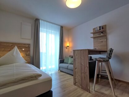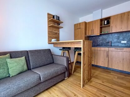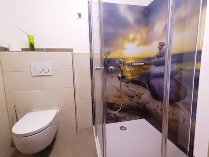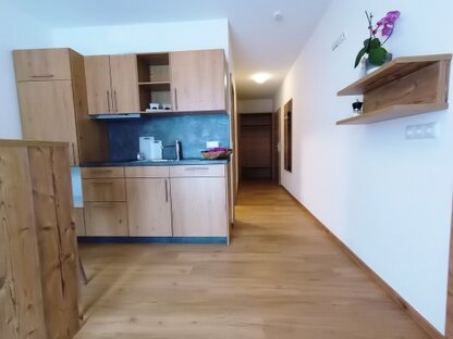 Die Ferienwohnung mit 23 qm Grundfläche liegt im Erdgeschoss und verfügt über einen Wohn-/Schlafraum, eine Küchenzeile mit Spülmaschine und Kühlschrank. Im Schlafraum kann bei Bedarf die Sitzgruppe zu einem vollwertigen Zusatzbett aufgestellt werden. Badezimmer mit Dusche/WC. Die Wohnung ist mit Sat-TV, W-LAN ausgestattet. Geschirr, Handtücher und Bettwäsche sind vorhanden, bei Bedarf stellen wir Ihnen gerne Kinderbetten und Hochstuhl zur Verfügung. Die Einrichtung ist im modernen Landhausstil gehalten. Ein Terrasse ist vorhanden. Zusätzlich können mitgebrachte Fahrräder in einer abschließbaren Fahrradgarage eingestellt werden.